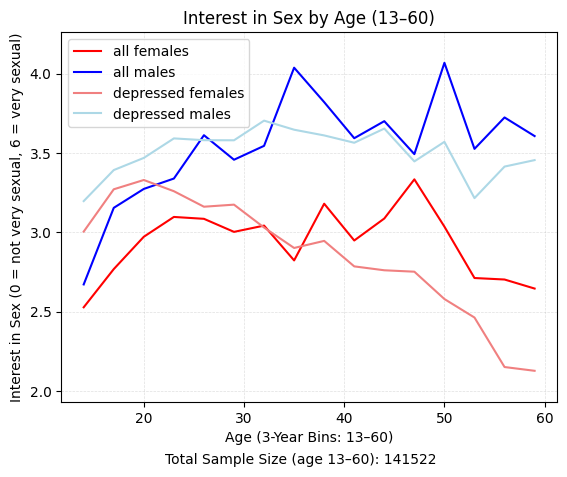 Sexual Interest by Age and Gender The results of the personality test item “I am very sexual” (0 = not very sexual, 6 = very sexual) answered by 142k test takers show several consistent patterns across age and depression status. First, sexual interest rises from early adolescence into the 20s for both males and females. Among males, interest remains elevated through the 30s and appears to peak again in midlife before gradually declining. Females show a more moderate rise into early adulthood, with a flatter trajectory overall and a more pronounced decline after midlife. These patterns suggest that self-perceived sexual interest is not linear across the lifespan, but instead follows a developmental curve with midlife stabilization or secondary peaks in some groups. The mid-30s to early-40s elevation in male sexual interest is broadly consistent with large population research suggesting that male sexual desire does not simply decline steadily after youth, but can remain high or even peak in midlife (Nature Scientific Reports study). Other large-scale analyses have similarly found nonlinear age effects in sexual desire, rather than a uniform decline across adulthood (PMC study on age and sexual desire). In this sense, the present findings align with the growing evidence that midlife male desire may be more robust than commonly assumed. One notable pattern in the data is that younger depressed males and females report slightly higher sexual self-ratings compared to their non-depressed counterparts, with this pattern reversing after approximately age 35. The literature offers partial support for this age-dependent shift. Among adolescents and young adults, depressive symptoms have been linked with increased sexual risk behavior and greater sexual activity in some contexts (PMC study on depression and adolescent sexual behavior). However, in adult populations, depression is more consistently associated with reduced sexual desire and sexual dysfunction (PMC review on depression and sexual dysfunction). Additionally, antidepressant use—particularly SSRIs—is well documented to reduce libido and sexual functioning (PMC review on antidepressants and sexual side effects). If antidepressant exposure increases with age or depression severity, this could help explain the post-35 reversal observed in the present chart. The early-50s elevation observed in some subgroups is less clearly supported in the broader literature. While some midlife stability or resilience in desire has been documented, most population-level studies show either plateauing or gradual decline rather than a distinct secondary peak in later adulthood. This suggests that the early-50s increase in the present dataset may reflect cohort composition, relationship status differences, or selective sampling rather than a universal biological effect. Overall, the findings largely align with published evidence showing nonlinear age trajectories in sexual desire, stronger midlife persistence among males, and age-dependent differences in how depression relates to sexual interest. Where the data diverges—particularly regarding later-life peaks—the differences may reflect sample composition, measurement differences (self-concept versus frequency or physiological function), or medication effects. |
